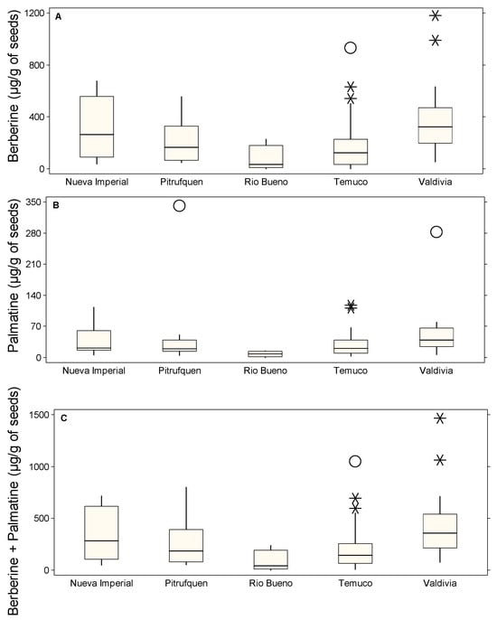 Box plots showing the concentrations of seeds alkaloids (µg/g of DM) in different locations: Nueva Imperial, Pitrufquén, Río Bueno, Temuco, and Valdivia. (A) Berberine, (B) palmatine, and (C) berberine + palmatine. The boxes represent the interquartile range (IQR), the horizontal line within each box indicates the median, whiskers extend to 1.5 times the IQR, and circles denote probable outliers and asterisks denote possible outliers.