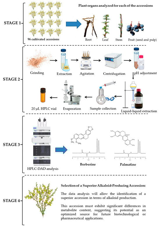 A selection process was carried out to identify a superior accession from 96 cultivated accessions based on alkaloid metabolite analysis. Initially, different plant organs (root, leaf, stem, and fruit) were analyzed to determine which parts had the highest alkaloid content. The selected samples underwent grinding, solvent extraction, agitation, centrifugation, pH adjustment, and liquid–liquid extraction to isolate the target compounds. The extracts were then concentrated and prepared in 20 μL vials for chromatographic analysis. HPLC was used to quantify and characterize key alkaloids, such as berberine and palmatine, allowing for metabolic profile comparisons among the ecotypes. Based on these results, a superior accession was identified, displaying significant metabolic differences, suggesting its potential as an optimized source for biotechnological or pharmaceutical applications (Figure 7).