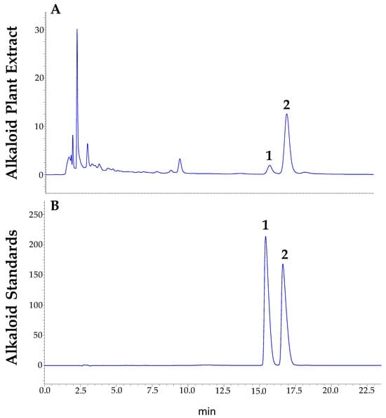 Chromatographic analysis was performed using a Shimadzu LC-2050C 3D high-performance liquid chromatograph, equipped with a Restek ROC C18 column (4.6 × 250 mm × 5 µm). The mobile phase consisted of a mixture of acetonitrile and a solution containing 20 mM KH2PO4 (pH 2.8) in a 25:75 ratio. The column temperature was maintained at 40 °C, and detection was carried out at a wavelength of 229 nm for berberine and 344 nm for palmatine. The flow rate was set at 1.0 mL/min, and 10 μL of the sample was injected. The elution process was performed in isocratic mode. For the calibration curve, stock solutions of berberine and palmatine were prepared by dissolving each alkaloid in methanol to obtain a concentration of 500 mg/mL. These solutions were then diluted with methanol to generate working standard solutions. Calibration curves were established for both compounds to evaluate the linearity of the method, using standard solutions ranging from 0.0976 to 100 µg/mL. The working range was defined as 0.43–12.5 µg/mL for berberine and 0.14–12.5 µg/mL for palmatine. The identification of berberine and palmatine was based on the comparison of retention times of the peaks with those of pure standards. Both alkaloids showed excellent linearity, with correlation coefficients (R²) of 0.9999, confirming the reliability of the method for quantitative analysis within the selected concentration ranges. To establish the limits of detection (LOD) and quantification (LOQ), serial dilutions of each stock standard solution were prepared using MeOH as the solvent. Each of these solutions was injected into the HPLC instrument until a signal-to-noise (S/N) ratio of 3 was reached for the LOD and a ratio of 10 for the LOQ of each alkaloid compound. Based on this approach, the LOD and LOQ for berberine were determined to be 0.14 µg/mL and 0.43 µg/mL, respectively, while for palmatine they were 0.04 µg/mL and 0.14 µg/mL. These values are method-based and apply across all plant organs analyzed (roots, stems, leaves, and seeds), as the same analytical procedure was used for all matrices. Berberine chloride (purity, >98%), palmatine chloride (purity, >97%), and all analytical grade solvents used for extractions were purchased from Sigma Aldrich (St. Louis, MO, USA) [53]. Berberine and palmatine were successfully separated under these chromatographic conditions, showing sharp and well-resolved peaks with no overlapping, as illustrated in Figure 8, confirming the efficiency of the method.