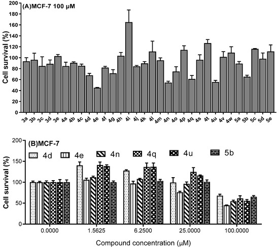 (A) Cytotoxicity of the target compounds on MCF-7 at 100 μM. (B) Cytotoxicity of the target compounds on MCF-7 at 0~100 μM (cytotoxicity of target compounds toward cells were determined by MTT assay, and data are presented as mean ± SD for three independent tests).