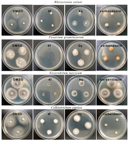 Figure 2 exhibits the mycelial growth of the DMSO group, 4f group, 4q group, and positive drug group at drug concentration of 50 μg/mL against three plant pathogens. As can be seen from Figure 2, mycelia in the DMSO group grew faster with a good state, and the positive drug inhibited the three plant pathogens to varying degrees. At this concentration level, the inhibitory effect of 4q against F. graminearum, C. capsica, and B. cinerea was slightly lower than that of positive drugs, but stronger than that of the positive drug against E. turcicum. It is gratifying that the inhibitory effect of 4f on the five fungi is better than that of positive drugs at high concentration levels.