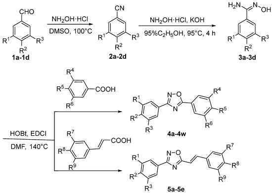 As shown in Scheme 1, 1,2,4-oxadiazole series compounds 4a–4w and 5a–5e containing anisic acid or cinnamic acid were synthesized. Compounds 2a–2b used substituted benzaldehyde as the starting material and were heated at 100 °C in the mixture of DMSO and hydroxylamine hydrochloride until no bubbles were formed. E-N′-hydroxybenzimidamide (amidoxime 3a–3d) was obtained by the reaction of 2a–2b with hydroxylamine hydrochloride under alkaline conditions. Then, in anhydrous DMF, compounds 4a–4w and 5a–5e were obtained by reacting with different anisic acid or cinnamic acid derivatives with EDCI, HOBt, and TEA as the condensation agent. The specific synthesis and purification steps are listed in the experimental section, and the structure of the obtained compounds is shown in Table S1.