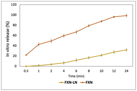In vitro release of free fucoxanthin solution (FXN) and fucoxanthin-loaded nanoliposomes (FXN-LN) in PBS (pH 7.4) at 37 °C. Data are presented as mean ± standard deviation (n = 3).