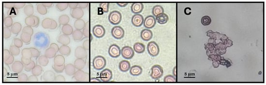 Figure 3 presents three micrographs (A, B, and C) illustrating the morphological state of human erythrocytes under different experimental conditions. In Figure 3A, healthy erythrocytes exhibit their characteristic morphology: biconcave cells with a round and uniform shape, homogeneous coloration, and no apparent alterations in the plasma membrane. The biconcave structure is essential for the erythrocyte function, as it maximizes the surface area for gas exchange and ensures optimal deformability for passage through the capillaries. Additionally, a bluish-stained cell, likely a leukocyte, can be observed, which is a common finding in blood smears. Under these basal conditions, erythrocytes maintain their structural integrity without signs of hemolysis or deformation, indicating a physiologically stable environment free from significant oxidative stress.