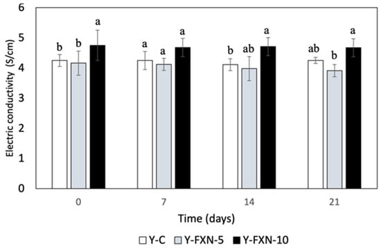The electrical conductivity of yogurt formulations was affected by the incorporation of fucoxanthin-loaded nanoliposomes and cold storage over 21 days (Figure 4). The control yogurt (Y-C) maintained stable conductivity (~4.3 S/cm), while yogurt with 5% fucoxanthin (Y-FXN-5) showed a greater decline (4.16 to 3.91 S/cm), indicating a possible ionic imbalance or matrix instability. In contrast, yogurt with 10% fucoxanthin (Y-FXN-10) exhibited a minor reduction (4.7 to 4.6 S/cm), suggesting a stabilizing effect at higher concentrations. Electrical conductivity, a key indicator of matrix homogeneity and product quality, reflects modifications in the ionic balance due to nanoliposome dispersion [56]. Significant variations could indicate undesirable interactions affecting the texture and flavor. These findings align with previous studies on bioactive nanocarriers in dairy products, where the nanoliposome encapsulation of antioxidants, such as curcumin, influenced the electrical properties [57,58,59]. The observed conductivity changes reinforce the relevance of nanotechnology in enhancing yogurt stability and functionality.