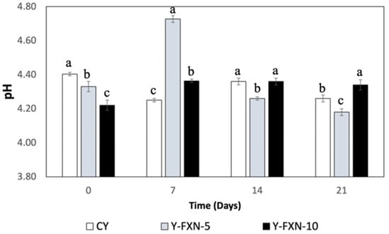 Effect of nanoliposome addition and cold storage time on the titratable acidity of yogurt formulations. All data were analyzed using one-way ANOVA with interactions. Means with different superscript (a,b: pH effects) within the same treatment are significantly different. Bars without lowercase letters indicate no significant differences. Y-C = Control Yogurt without nanocapsules; Y-FXN-5 = Yogurt enriched with 5% nanocapsules; Y-FXN-10 = Yogurt enriched with 10% nanocapsules. Bars represent the standard deviation of at least three replicates (n > 3) per concentration.
