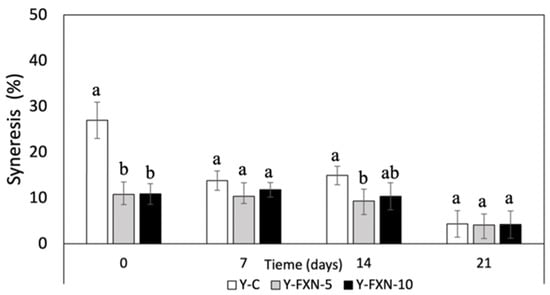 Effect of fucoxanthin-loaded nanoliposome addition and cold storage time on the syneresis susceptibility of yogurt formulations. All data were analyzed using two-way ANOVA with interactions. Means with different superscript (a,b: storage time effects) within the same treatment are significantly different. Y-C = Control Yogurt without nanocapsules; Y-FXN-5 = Yogurt enriched with 5% nanocapsules; Y-FXN-10 = Yogurt enriched with 10% nanocapsules. Bars represent the standard deviation of at least three replicates (n > 3) per concentration.