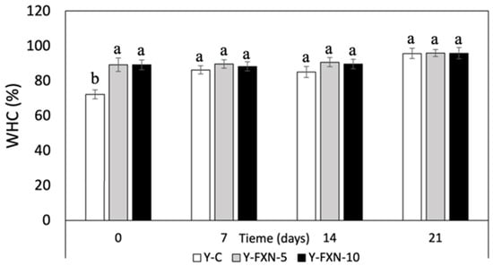 Effect of the addition of nanoliposomes and cold storage time on the water-holding capacity of yogurt formulations. All data were analyzed using two-way ANOVA with interactions. Means with different superscript (a,b: storage time effects) within the same treatment are significantly different. Y-C = Control Yogurt without nanocapsules; Y-FXN-5 = Yogurt enriched with 5% nanocapsules; Y-FXN-10 = Yogurt enriched with 10% nanocapsules. Bars represent the standard deviation of at least three replicates (n > 3) per concentration.