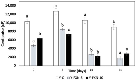 Effect of fucoxanthin-loaded nanoliposome addition and cold storage time on yogurt formulations’ viscosity (cP). Means with different superscript (a–c: storage time effects) within the same treatment are significantly different. Y-C = Control Yogurt without nanocapsules; Y-Ant-5 = Yogurt enriched with 5% nanocapsules; Y-Ant-10 = Yogurt enriched with 10% nanocapsules. Bars represent the standard deviation of at least three replicates (n > 3) per concentration.