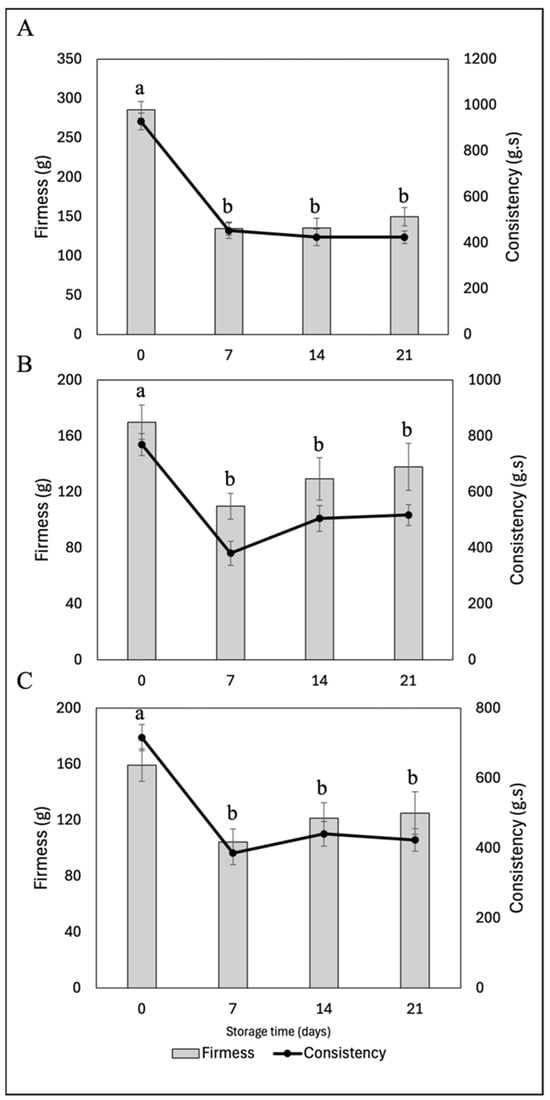 Effect of adding nanoliposome vehicles to yogurts under different cold storage times on their textural properties (firmness and consistency). (A) Y-C: Control Yogurt; (B) Y-FXN-5: Yogurt enriched with 5% of fucoxanthin-loaded nanoliposome; (C) Y-FXN-10: Yogurt enriched with 10% of fucoxanthin-loaded nanoliposome. Lowercase letters indicate significant differences.