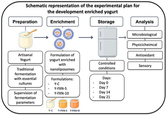 The prolonged storage of enriched yogurt can change its physicochemical properties, such as its acidity, pH, viscosity, and texture. The acidification of yogurt during storage can affect its taste and acceptability [17,18]. Additionally, changes in the structure of the dairy matrix and the distribution of added compounds can affect the homogeneity and stability of the product. The rheology of yogurt, i.e., its behavior under deformation and flow, can change during storage due to the reorganization of the dairy structure. This can manifest in changes in the yogurt’s viscosity, elasticity, and fluidity [19,20]. The formation of whey and phase separation can also occur during prolonged storage, affecting the product’s texture and consistency [19,20]. Therefore, it is important to conduct stability studies during storage to evaluate how these changes impact the quality and acceptability of enriched yogurt [21,22]. These studies will provide a better understanding of the mechanisms of deterioration during storage and help develop strategies to improve the stability and quality of yogurt enriched with antioxidant compounds, analyzing the impact of nanoliposome addition on the antioxidant, physicochemical, rheological, and sensory properties.