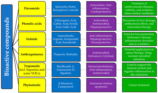 Anthraquinones found in Galium species exhibit antimicrobial and anticancer properties [6,54]. Phytosterols help reduce blood cholesterol and exhibit antitumor activity [54,61,62]. Saponins exhibit antifungal and antimicrobial potential [55,57].