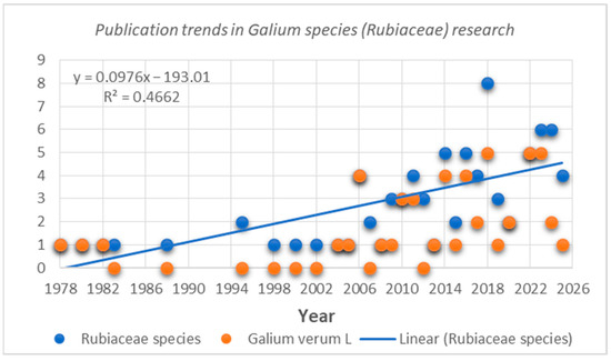 Galium verum L. (commonly known as Yellow or Lady’s Bedstraw or Eniovche in Bulgarian) is one of the most widespread species of the genus Galium. It is rich in phytochemical compounds with significant biological activity, making it one of the most versatile medicinal plants traditionally used for the prevention and treatment of many diseases due to its anti-inflammatory, anticancer, hepatoprotective, diuretic, cardioprotective, and astringent properties [21,35,65,66,67,68,69,70,71,72,75,76,77,79,80,81,82,83,84,85,86]. This species has deep roots in Bulgarian traditional medicine, and there is even a holiday named after it, celebrated every year on June 24th. Its name is Eniovden, and it is also known as Midsummer—the longest day of the year. On this day, it is believed that the herbs have the greatest power, and according to tradition, women should go out early in the morning to collect them [87].