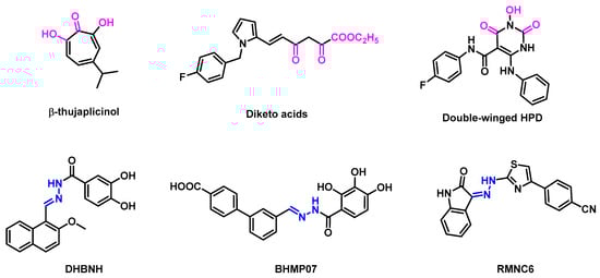 Chemical structures of some representative RNHIs. The pink areas indicate the three-oxygen pharmacophore of the RNHIs. The blue areas show the hydrazone moiety.