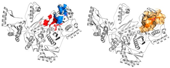 According to the available literature, in the case of hydrazone/hydrazine RNase H inhibitors, the binding pocket has been predicted to occur at the interface between the DNA:RNA substrate and the RNase H domain, in the vicinity of residue Q500 []. This residue has been proven to interact with the RNA strand in the RNA:DNA double-stranded substrate, which has drawn attention to the search for some novel druggable sites for RNase H inhibition [,]. Solution NMR experiments [] and docking results for BHMP07 demonstrated that residues near BHMP07 included D443, G444, A445, S499, Q500 and Y501 (Figure 3: blue domain). Another result of mutagenesis studies [] demonstrated that the residues within the RT RNase H domain, specifically N474, Y501, A502 and A508, played a pivotal role in the inhibition of the endonuclease activity of RT by the inhibitor RMNC6 (Figure 3: red domain). Therefore, we defined the binding site as an 8 Å grid centered on key residues, including the highly conserved key residues D443, E478, D498, and D549, which chelates Mg2+ and Q500 of the p66 subunit of HIV-1 RT (Figure 3: orange domain).