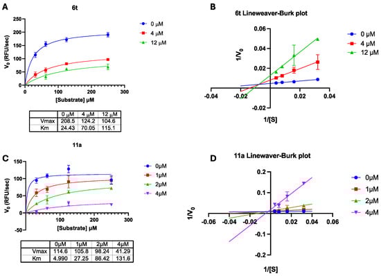 (A,B) Compound 6t competition experiment: (A) Michaelis Menten and (B) Linewaver–Burk plot both display a pattern typical of a mixed model inhibitor. (C,D) Compound 11a competition experiment: (C) Michaelis Menten and (D) Linewaver–Burk plot both display a pattern typical of a mixed model inhibitor.