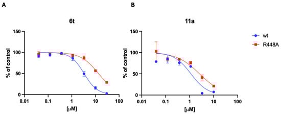 Dose–response curve of the inhibition of HIV-1 RT-associate RNase H activity curve with HIV-1 RT wt (blue) and HIV-1 RT R448A (red) (A) 6t compound (B) 11a compound.