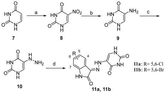 The synthesis of compounds 11a and 11b was performed as reported in Scheme 2. The commercially available uracil (7) is nitrated in a 1:3 system of concentrated nitric and sulphuric acids to afford 5-nitropyrimidine-2,4(1H,3H)-dione (8). Subsequently, the compound 8 proceeded through a reduction reaction, resulting in the formation of 5-aminopyrimidine-2,4(1H,3H)-dione (9). This was then reduced to the 5-hydrazinepyrimidine-2,4(1H,3H)-dione (10), the pivotal intermediate 10, via the Sandmeyer reaction. Afterward, 5-hydrazineylpyrimidine-2,4(1H,3H)-dione (10) was condensed with the suitable substituted isatin in the presence of catalytic glacial acetic acid in absolute ethanol at refluxing for 2 h. The target compounds 11a and 11b were isolated in good yields ranging from 70% to 83% as a yellow solid.