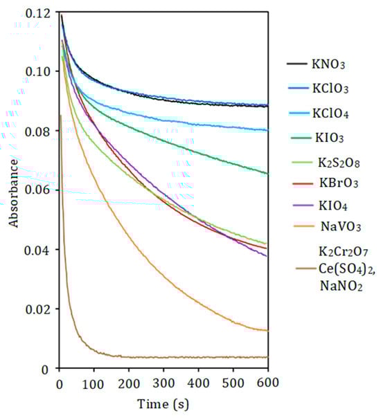 The rate of PD oxidation correlates with the strength of the oxidant (Figure 2). Potassium dichromate, sodium nitrite, and cerium (IV) sulfate require 2–3 min to oxidize DIDC, whereas the reaction with permanganate occurs almost instantaneously. For the first three oxidizing agents, partial destruction of the dye in IA was observed. Permanganate completely oxidizes the dye ions that are part of the IA. Other oxidants studied oxidize DIDC too slowly. The use of an acidified mixture of molybdate and vanadate as both reagent and oxidant allows selective oxidation of only free dye ions not bound by HPA. Therefore, this mixture was chosen as the oxidizing agent. It was taken into account that IA in this case had the highest molar absorptivity, and the reproducibility of the results obtained with this reagent was the best. Also, compared to 12-molybdophosphate, mixed 11-MVP was found to be more stable in the strongly acidic medium used in the oxidation reaction studied. Other PDs including Astra Phloxine were stable to oxidation by most oxidizing agents tested. The mixture of Fe (II) and H2O2 used previously for the oxidation of DIDC [] was excluded from consideration because H2O2 can degrade HPA, given the well-known ability of molybdenym (VI) and vanadium (V) to form stable peroxo complexes.