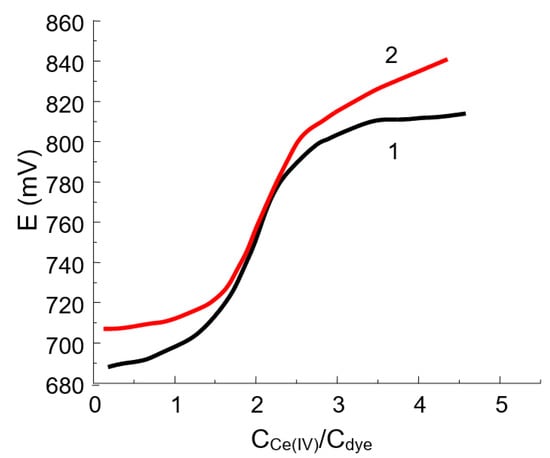 Titration curves for 10 mL of 0.112 mM DIDC (1) and 10 mL of 0.134 mM Pr-DIDC (2) with 1 mM cerium (IV) sulfate.