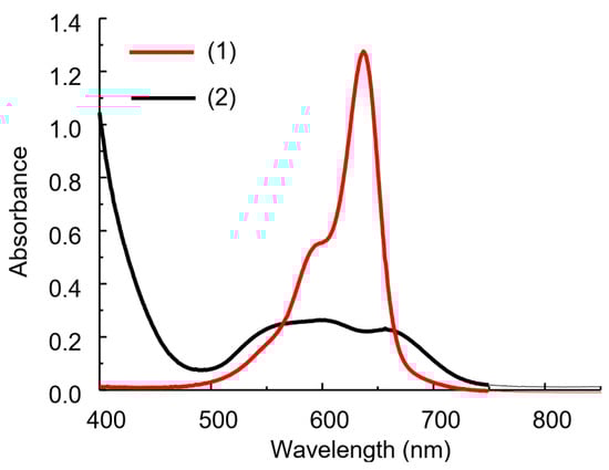 The theory of self-aggregation of organic dyes can satisfactorily explain both the changes in the absorption spectra of PDs resulting from the formation of IA with 12-MPC and the selective oxidation of free dye ions. Self-aggregation of organic molecules has attracted interest in recent years in both fundamental and applied fields due to its novel chemical, physical, and optical properties. Self-aggregation of dyes in solution is a frequently occurring phenomenon in the chemistry of organic dyes due to the strong π–π dispersion interaction between the conjugated system of π-electrons in these molecules [,,,,,]. In the reactions studied in this work, conditions were created for forced convergence of dye cations as a result of the formation of sparsely soluble nanodispersed particles of IA. In this case, the π–π-dispersion interaction of the chromophoric–aromatic system of dyes increases, which, in accordance with the exciton theory, leads to the splitting of the excited electron level into two levels with lower and higher energy. The transition of electrons to these levels results in the appearance of one or two hypso- and/or bathochromically shifted bands in the absorption spectrum relative to the main dye band.
