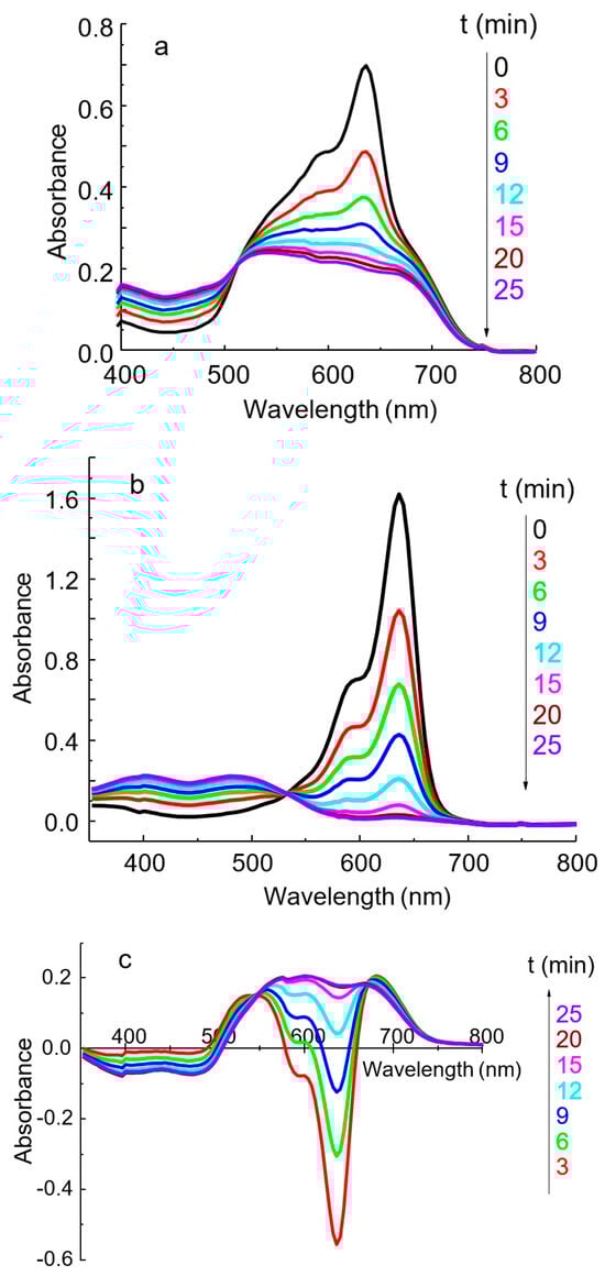 The IA spectrum differs significantly from the dye spectrum as a result of the reaction between HPA and DIDC (Figure 4) [,]. The solution spectra of the system under study represent the sum of the spectra of the oxidized and reduced forms of the dye, as well as the IA spectrum of DIDC with HPA. After 15–20 min, the oxidation of the excess dye is complete, and only IA remains in the reaction mixture. The spectrum of IA or actually aggregated dye consists of several strongly overlapping bands and has no pronounced maximum (Figure 4 and Figure 5a). As can be seen particularly well from the difference spectrum (Figure 5c), the dye band at 636 nm completely disappears. Instead, two bands appear in the spectrum at approximately 540 and 680 nm, shifted hypso- and batochromically with respect to the main dye band (Figure 5c). It is worth noting that a completely similar IA spectrum can be obtained without oxidation under conditions of large excess of counterion. The DIDC spectrum obtained in a tenfold excess of 11-MVP (Figure 4) contains the same three bands that were observed in the IA spectrum remaining after oxidation of the dye excess.