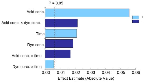 The effects of individual factors and their combinations were determined (Table S2). According to these studies, all three effects studied are significant, with acid concentration having the greatest influence. The interactions (acid concentration × dye concentration) and (acid concentration × time) are also statistically significant. In the Pareto chart (Figure 7), positive values represented by time and acid concentration indicate that upon their increase, the response also increases, while a negative value for dye concentration means that this factor has the opposite effect (Table S3).