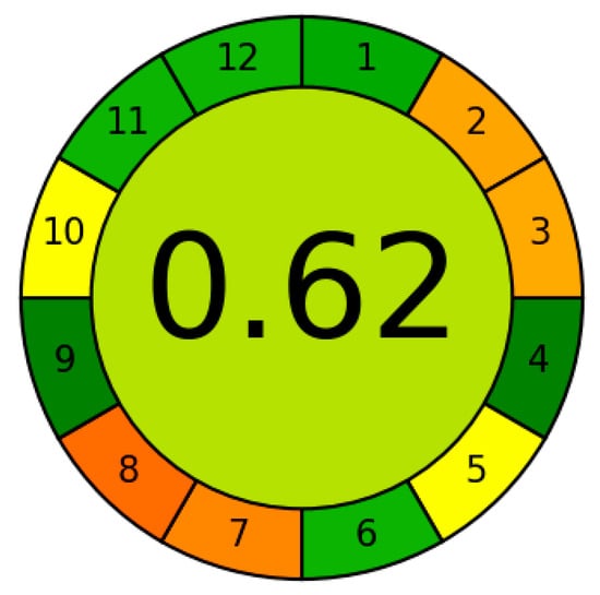 A comparison of the different methods developed for the determination of orthophosphate from 2019 to the present is presented in Table 5. Spectrophotometric methods based on the reduction of12-MPA by ascorbic acid and the formation of heteropolyblue remain in the spotlight. They are often combined with modern preconcentration methods and automated with flow methods of analysis. IAs are also used as analytical forms in combination with three detection methods, namely UV–Vis spectrophotometry, resonance Rayleigh scattering, and fluorescence. In terms of sensitivity, the method developed in this work competes confidently with all recently proposed methods. The advantage over methods based on the formation of heteropolyblue is due to the much higher molar absorption coefficient of IA DIDC-12-MPA, almost an order of magnitude higher. For heteropolyblue, it ranges from 15,000 to 24,000 mol−1 L cm−1 depending on the method. For the same reason, the sensitivity of the present method is superior or equal to methods using UV–Vis detection and preconcentration. The absolute limit of detection of most electrochemical, chromatographic, and atomic spectroscopic methods is also lower than that of the proposed method, although it should be noted that this table does not include methods developed before 2019. The greenness of the developed method was evaluated using the Analytical Greenness (AGREE) metric (Figure 8). The obtained score of 0.62 confirms its sufficiently high environmental friendliness.