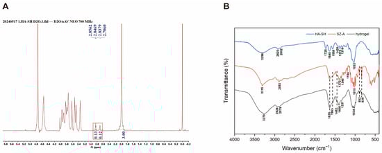 (A) NMR hydrogen spectrum of HA-SH. (B) Infrared spectrogram of the gel.