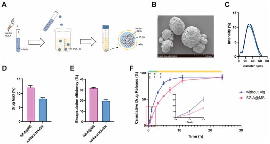 The microspheres were prepared according to the following steps (Figure 2A). The microspheres appeared spherical under SEM (Figure 2B). The porosity of the microspheres was 9.11% ± 1.27%. The particle size of the SZ-A@MSs, measured using a Malvern laser particle-size analyzer, was approximately 30 μm (Figure 2C). The SZ-A content in the microspheres was measured by HPLC, wherein SZ-A@MSs without the HA-SH group had no HA-SH added to the inner aqueous phase. The results showed that the addition of HA-SH to the inner aqueous phase can significantly improve the drug loading and encapsulation efficiency. The drug loading of SZ-A@MSs was approximately 12.0% (Figure 2D), and the encapsulation efficiency was approximately 31.7% (Figure 2E). The mixture of HA-SH and SZ-A has the property of forming hydrogels, which can significantly improve the stability of primary emulsion (W1/O) through hydrogen bonding and reduce the leakage of water-soluble drugs during the preparation process [].