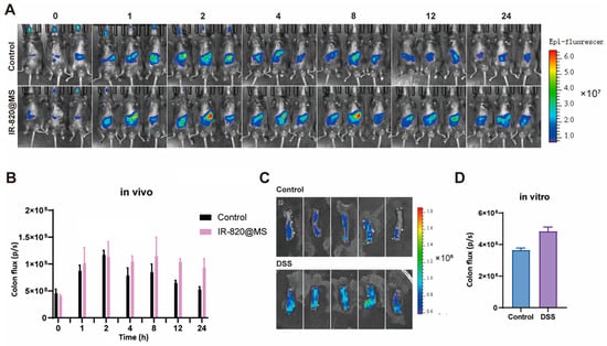 Microspheres containing fluorescent dyes (IR-820@MS) were prepared and administered orally to DSS-induced model mice. DSS-induced model mice can better simulate the colon condition of diseased mice. Mice in the control group received the same amount of IR820 fluorescent dye solution orally (Figure 3A,B). Through fluorescence imaging results and quantification of the relative fluorescence intensity of each mouse, the results showed that compared with the control group, stronger fluorescence signals were observed at the 12 h and 24 h time points, and the fluorescence signal attenuation amplitude was smaller, indicating that the fluorescent microspheres stayed in the intestinal tract of the mice for a longer time, proving that the microspheres have a good colon-targeting effect, which can prolong the retention time of the drug in the body to target colon tissue.