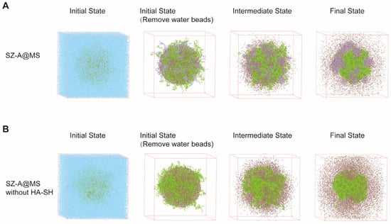 Dissipative Particle Dynamics (DPD) is a coarse-grained molecular simulation algorithm. The microsphere system was simulated by Materials Studio and the addition of HA-SH in the inner aqueous phase was modeled to affect the diffusion of SZ-A. Green beads represent PLGA, brown beads represent SZ-A, purple beads represent HA-SH, and blue beads represent water. The sphere is filled with PLGA and SZ-A, HA-SH is added according to the situation, and the rest is filled with water, and the entire system simulates microsphere preparation (Figure 4). The results show that the addition of HA-SH can reduce the escape of SZ-A from the inner aqueous core, indicating that the hydrogen bonding interaction between HA-SH and SZ-A can prevent SZ-A from leaking and diffusing into the outer aqueous phase during preparation, which is consistent with the experimental finding that HA-SH can increase the encapsulation rate of SZ-A in microspheres.