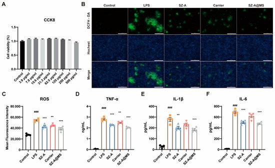 LPS-induced RAW264.7 cells were treated with SZ-A, carrier, and SZ-A@MSs. The cell supernatant was collected and the levels of the inflammatory factors IL-6, TNF-α, and IL-1β were determined using ELISA kits, and the intracellular oxidative stress levels were determined using ROS kits. The results showed that compared with the model group, the SZ-A@MS group had reduced ROS (Figure 5B,C) and reduced levels of secreted IL-6, TNF-α, and IL-1β (Figure 5D,F), indicating that the SZ-A@MSs have good anti-inflammatory and anti-ROS production effects. It is speculated that the anti-inflammatory effect of SZ-A@MSs is due to SZ-A and HA-SH, which have definite anti-inflammatory effects. The carrier group had certain anti-inflammatory and antioxidant effects, probably due to the presence of HA-SH. Hyaluronic acid has been shown to have good anti-inflammatory properties []. Combined with the results of CCK-8, the cell survival rate of each group was maintained above 95%, indicating that SZ-A@MSs do not exert their anti-inflammatory effect by inhibiting cell proliferation and killing cells.