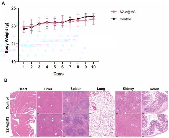 All C57BL/6J male mice were randomized into two groups. Mice in the control group received saline (0.9% NaCl) and mice in the SZ-A@MS group received SZ-A@MSs for 10 days (n = 3). Body weight changes were recorded and the mice were sacrificed on day 11. Heart, liver, spleen, lung, kidney, and colon tissues from each group were fixed in 4% paraformaldehyde and examined histopathologically by H&E staining.