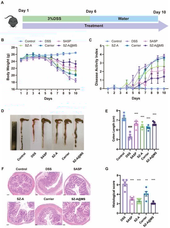 Thirty male C57BL/6J mice (6–8 weeks old) were acclimatized for 1 week. The mice were randomly divided into six groups: control group, DSS group, SASP group (positive drug 300 mg/kg SASP treatment), SZ-A group (25 mg/kg SZ-A treatment), carrier group (microspheres without SZ-A), and SZ-A@MS group (equal to 25 mg/kg SZ-A). Except for the control group, mice were administered 3% DSS (M.W: 36,000–50,000; MP Biomedicals, Santa Ana, CA, USA) solution dissolved in freely available drinking water for 5 days. SZ-A or SASP was orally administered daily from the beginning to the end of the experiment. Samples were collected on day 10.