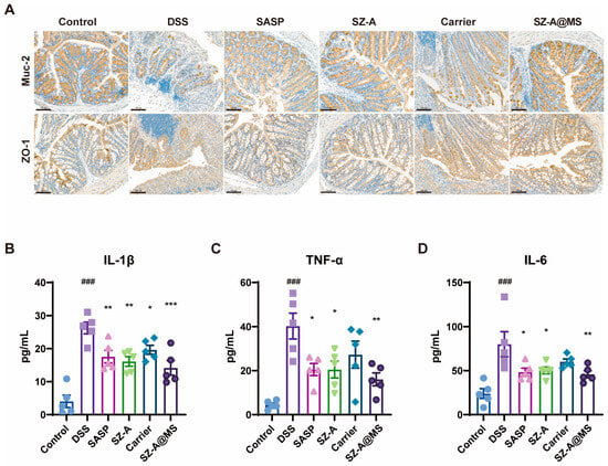 UC leads to an elevated inflammatory response []. Cytokines are important signaling molecules in the immune system and play a key regulatory role in the initiation, maintenance, and extinction of the inflammatory response []. In UC, dysregulation of cytokine networks is one of the important characteristics of the disease pathophysiology []. Overexpression of pro-inflammatory cytokines leads to a sustained inflammatory response and tissue damage []. The inflammatory factors in the serum of mice were measured by ELISA, and the results showed that the pro-inflammatory factors of the DSS-induced model group mice were significantly increased, including TNF-α, IL-1β, IL-6 (Figure 8B–D). After treatment, the levels of inflammatory factors in each treatment group decreased, and the ability of the SZ-A@MS group to reduce inflammation was better than that of the carrier group. This result suggests that, combined with its effect of improving intestinal barrier function, SZ-A@MSs may exert a synergistic therapeutic effect by blocking the vicious cycle of inflammation and barrier disruption.