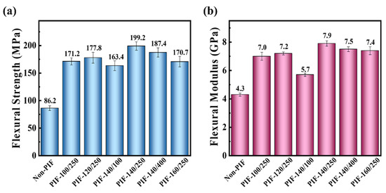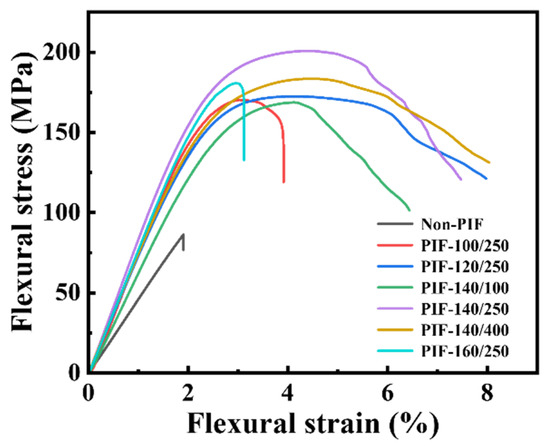 The typical flexural stress–strain curves of the HA/PLLA composites are shown in Figure 1. The flexural toughness of the HA/PLLA composites was significantly enhanced through PIF processing, as evidenced by their fracture modes. The fracture process of Non-PIF displayed a characteristic brittle fracture behavior, with the stress abruptly dropping to zero upon reaching a maximum value. In contrast, PIF-processed samples exhibited progressive stress reduction after reaching maximum stress, and were accompanied by the development of distinct plateau regions, which were particularly evident for PIF-120/250, PIF-140/250, and PIF-140/400, showing characteristics of ductile fracture.