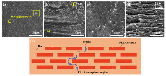 The microstructure can be observed by SEM on the flexural fracture surfaces of HA/PLLA composites, as shown in Figure 3a,b. An aggregation phenomenon of HA was observed in the non-PIF sample and PIF-140/250, due to the poor compatibility between PLLA and HA [16]. After PIF processing, the PLLA matrix produced a solid flow orientation under the combined action of temperature and pressure. To further trace the orientation microstructure of the PLLA matrix more clearly, an NaOH/methanol solution was used to dissolve the HA on the fracture surface while etching the PLLA amorphous region, as shown in Figure 3c,d. Compared with the non-PIF sample, PIF-140/250 had obvious multi-level stacked crystal layers. It is well known that crack propagation preferentially occurs in the amorphous phase since the strength of the crystalline regions is higher than that of the amorphous regions [29]. However, when the fracture behavior occurred, crack propagation could be impeded effectively by the multi-level stacked crystal layers. Figure 3e illustrates a schematic diagram of the layer structure of the HA/PLLA composites processed by PIF technique. The slippage and pull-out of the crystal layer significantly increased the damage energy, leading to the continuous crack deflection within the amorphous regions, which ultimately contributed to the impressive mechanical properties of the PIF-140/250.