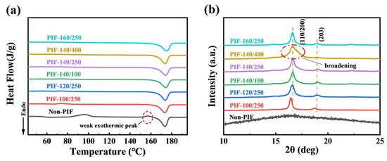 Figure 4a presents the DSC heating curves of non-PIF and PIF-processed HA/PLLA composites. The thermal parameters derived from Figure 4a are listed in Table 3. The non-PIF sample had an obvious cold crystallization peak and a melting peak, and notably, a weak exothermic peak was observed. During the DSC heating scan, cold crystallization resulted in the formation of numerous α’ crystals, accompanied by the transformation from α’ crystals to α crystals above 120 °C, generating weak exothermic peaks [32]. After PIF processing, all samples only exhibited a distinct endothermic melting peak in the DSC thermogram, suggesting an increase in crystallinity, which was attributed to the synergistic effects of cold crystallization and strain-induced crystallization during the PIF processing. The disappearance of the weak exothermic peak for the HA/PLLA composites PIF processed above 120 °C was due to the fact that the majority of α’-to-α crystal transformation occurred during PIF processing. Differently, no significant weak melting peaks were observed in the sample processed at 100 °C, as the α’-to-α crystal transition was completed at a lower temperature compared to the non-PIF sample, resulting from the markedly reduced cold crystallization effect during the DSC heating scan. Among all samples, the PIF-160/250 had the highest crystallinity degree of 60.4% and the highest melting temperature (Tm). This may be because the strain-induced crystallization of PLLA was more pronounced, and the thickness of the lamellae of the original crystals was further increased at the combination of high temperature (160 °C, near the Tm of PLLA) and pressure [33].
