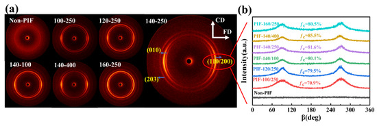 Figure 5a presents the 2D-WAXD patterns of HA/PLLA composites. The non-PIF sample exhibited uniform and blurred diffraction rings, indicating that the PLLA matrix was in an isotropic state. After PIF processing, all samples showed strong diffraction rings and degraded into equatorial arcs, with lamellae rotating from LD to FD [29]. In order to further analyze the change in the orientation of the crystalline region, azimuthal integration curves for the (110/200) crystal plane were obtained from the integral of the 2D-WAXD images, as shown in Figure 5b. No obvious peaks were observed for the non-PIF sample, while distinguishable peaks appeared after PIF processing. The narrower the half-height width of the peak, the higher the degree of orientation in the crystalline region [36,37]. For all PIF-processed samples, the oriented crystals consisted of two parts, namely strain-induced crystals and deformed or rotated primitive crystals. At a processing temperature of 140 °C, the crystallite orientation factor (fc) of PIF-processed samples increased with an increase in PIF processing pressure. The fc of PIF-140/400 reached a maximum of 85.5%, which was related to the fact that the high pressure was in favor of the molecular chains sliding and regularly arranging along the flow direction. At a processing pressure of 250 MPa, the fc of PIF-processed samples decreased when the processing temperature exceeded 140 °C. This may be due to the excessive activation of molecular chains induced by elevated temperatures, which facilitated the relaxation and de-orientation of the oriented molecular chains upon pressure release.