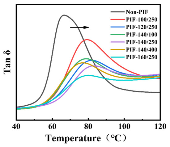 The tan δ curves of non-PIF and PIF-processed HA/PLLA composites as a function of temperature are illustrated in Figure 6. The glass transition temperature (Tg) of all PIF-processed samples determined by the peak temperature of tan δ curves dramatically shifted to higher temperatures compared to the non-PIF sample, which was consistent with the DSC results. PIF processing could reduce the free volume required for segment movement, which was hindered and required higher activation energy in the PIF-processed samples. In addition, the height of the tan δ peak also decreased significantly after PIF processing, which was attributed to the significant increase in PLLA crystallinity degree and the tight molecular stacking under the combined effects of pressure and temperature.
