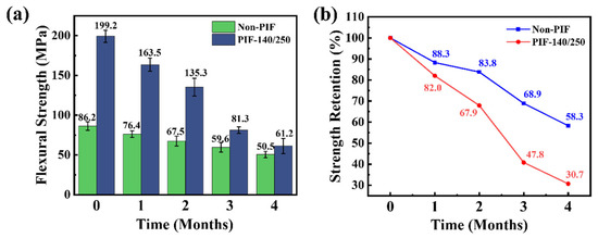 (a) Flexural strength and (b) strength retention of non-PIF and PIF-140/250 samples during various in vitro degradation cycles.