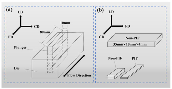 (a) Schematic diagram of PIF processing mold, and (b) appearance of the sample before and after PIF processing.