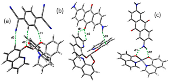 The interaction energies have been calculated to assess the strength of the exchange; this feature was estimated as the difference between the energy of the stable arrangement obtained for AlQ3-TCNQ, AlQ3-DAAq, and ZnQ2-DAAq and energies of isolated species [48]. Despite the previous results for distances and Hirshfeld surfaces, the interaction energies obtained are relatively small (−7.5, −4.9, and −8.1 kcal/mol for AlQ3-TCNQ, AlQ3-DAAq, and ZnQ2-DAAq, respectively), suggesting that the strength of the interactions in these compounds are in the order of a weak hydrogen bond. The Wiberg bond index (WBI) reinforces these results, since for AlQ3-TCNQ, the total WBI is 0.025, whereas for AlQ3-DAAq, it is only 0.011 (see Table 1). According to the WBI, in ZnQ2-DAAq, the two strongest hydrogen contacts can be found, with WBIs of 0.024 and 0.021. Based on these results, we proceeded with a new optimization process for these structures, incorporating the dispersion term GD3 into the corresponding Hamiltonian. As shown in Figure 3, the inclusion of GD3 in the calculations led to different stable arrangements compared to those obtained without it. In these newly optimized structures, we identified multiple hydrogen contacts and instances of eclipsed stacking. Upon initial inspection, four hydrogen contacts with an average length of 2.64 Å were recorded for AlQ3-TCNQ-GD3, while AlQ3-DAAq-GD3 and ZnQ2-DAAq-GD3 each exhibited only two, measuring 1.90 and 3.03 Å for the former and 2.00 and 2.74 Å for the latter (see Table 2). However, Hirshfeld surface analysis reveals a different perspective: in AlQ3-TCNQ-GD3, seven contacts between TCNQ and tris-(hydroxyquinoline) aluminum (Figure 3 and Table 2) can be identified. Among them, two hydrogen interactions between C-H and O-Al groups appear as red points in Figure 2d. A third red zone corresponds to an interaction between an O-Al group and a carbon atom in the ring. The remaining four interactions, visualized as white regions, indicate moderate interactions corresponding to two hydrogen bonds (C+N···H-C), one dihydrogen interaction, and one C=N···C contact (Figure 3 and Table 2).