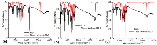 Thus, we use the spectra calculated with the GD3 term as a reference for characterizing the experimental spectra. For AlQ3-TCNQ, the most intense peaks in the 400–600 cm−1 region (see Figure 4a) correspond to in- and out-of-plane deformations arising from scissoring and twisting vibrations in AlQ3, which, in most cases, are coupled with twisting or wagging modes in TCNQ. Additionally, the peak near 650 cm−1 is associated with the symmetric stretching of O-Al bonds. In the first zone of the band at 700–850 cm−1, we found the breathing mode of the Q3, whereas the next section is completely dominated by wagging vibrations in both TCNQ and Q3. The narrow band at 1050–1100 cm−1 belongs to C-N and Al-N bond stretching and scissoring of H atoms in AlQ3. The extended band from 1170 to 1730 cm−1 corresponds to C-C, C-O, and C-N stretching bonds in the hydroxyquinoline rings. As expected, the band in 2050–2250 cm is the signal for TCNQ and can be associated with C-N bond stretching of the cyano groups. Differences between the theoretical and experimental IR spectra are observed, as previously reported in our earlier work, particularly in relation to the C-H vibrations in TCNQ [47]. Notably, a greater discrepancy appears in the 3000–3650 cm−1 region, which corresponds to symmetric and asymmetric C-H bond stretching in both AlQ3 and TCNQ. For AlQ3-DAAq, two broad bands can be distinguished in the 400–1750 cm−1 region (see Figure 4b), both containing mixed vibrational modes of AlQ3 and DAAq. In the 400–600 cm−1 band, alternating scissoring and twisting modes in Q3 and DAAq are evident. The narrow peak around 646 cm−1 corresponds to asymmetric and symmetric O-Al stretching vibrations, while the breathing modes of Q3 are found in the first section of the 750–1000 cm−1 band, along with wagging motions of H atoms in both Q₃ and DAAq. As with AlQ3-TCNQ, stretching modes appear in a broad 1000–1750 cm−1 band, with the most intense signals corresponding to DAAq. Within this band, alternating pure modes of DAAq and Q3 related to C-C and C-N stretching, accompanied by H-atom scissoring, are observed. The central section is characterized by in-plane deformations due to C-C, C-N, and C-O stretching in Q3, along with similar interactions in DAAq, plus H-atom rocking. The most intense breathing modes of DAAq are also found in this region. The next section similarly features C-C, C-N, and C-O stretching in both Q3 and DAAq, again accompanied by H-atom scissoring, with the most intense peak corresponding to C-C stretching in DAAq. Figure 4b shows that, for AlQ₃-DAAq, the experimental and theoretical spectra are in better agreement for the most energetic peaks in the 3000–3750 cm−1 band. The peak around 3040 cm−1 corresponds to C-H asymmetric stretching in Q3 and DAAq, while the remaining signals relate to N-H symmetric and asymmetric stretching in DAAq. For ZnQ2-DAAq (see Figure 4c), the most intense peaks in the 400–600 cm−1 band are associated with DAAq, corresponding to alternating twisting and scissoring motions in its rings. This band also contains Zn-O asymmetric stretching vibrations and intense wagging of H atoms bonded to O atoms in ZnQ2. In the first section of the 680–920 cm−1 band, the breathing modes of Q2 couple with twisting motions in DAAq rings, while the next section is dominated by wagging vibrations. The narrow band at 1000–1250 cm−1 is linked to alternating H-atom scissoring in Q2 and DAAq, whereas stretching modes extend across the 1300–1750 cm−1 range. The initial part of this band contains alternating in-plane deformations due to C-C and C-N stretching in both molecules, along with the breathing mode of DAAq, associated with the second most intense vibration in ZnQ2-DAAq. The most intense vibration is found in the central section, related to C-C, C-N, and C-O stretching in Q₂, coupled with C-C stretching in DAAq. In the final part of this band, C-C, C-N, and C-O stretching in Q2 is observed, alongside a C=O stretching mode at the band’s endpoint. Like AlQ3-DAAq, ZnQ2-DAAq shows good agreement with experimental spectra in the 3000–3600 cm−1 band, with signals corresponding to C-H stretching in Q2 and DAAq and N-H symmetric and asymmetric stretching.