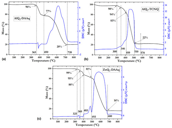 TGA and DSC curves of (a) AlQ3-DAAq, (b) AlQ3-TCNQ, and (c) ZnQ2-DAAq under an extra dry air atmosphere at a heating rate of 10°/min.