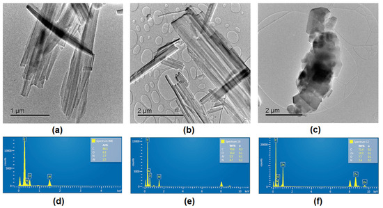 TEM images showing the morphology of the organic semiconductors: (a) AlQ3-TCNQ, displaying short nanobar structures (1–3 μm); (b) AlQ3-DAAq, exhibiting elongated nanobars (2–5 μm); and (c) ZnQ2-DAAq, consisting of nanoparticles with mixed morphologies, including hexagonal facets and semicircular shapes. EDS spectra for each respective sample (d–f).