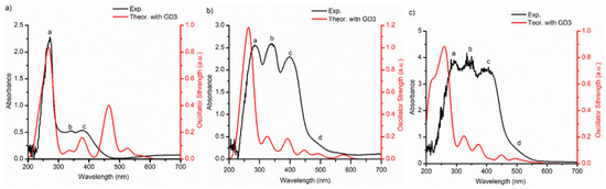 From left to right, comparison between experimental and theoretical absorbance spectra for (a) AlQ3-TCNQ-GD3, (b) AlQ3-DAAq-GD3, and (c) ZnQ2-DAAq-GD3 using TD-DFT PBE-GD3/TZP method. To build each theoretical spectrum, a Gaussian broadening of 30 nm was applied. In each spectrum the peaks and shoulders were labeled with the letters a–d.