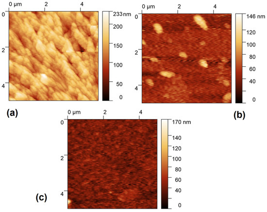 In the images obtained by AFM and presented in Figure 9, it can be observed that the film completely covers the entire surface of the substrate. Their morphology changes due to the type of dispersed heterojunction. In Table 5, it can be observed that the lowest root mean roughness (RMS) is presented by the ZnQ2-DAAq film. It is also important to highlight the mechanical properties of these films. ZnQ2-DAAq exhibits the lowest tensile strength (σ) and the lowest Knoop hardness (HK), making it the most susceptible to deformation and wear under service conditions. In contrast, AlQ3-TCNQ has a high tensile strength, while AlQ3-DAAq demonstrates the highest hardness. Since all films were manufactured under identical conditions, these results suggest that the type of dispersed heterojunction structure plays a crucial role in determining the film’s internal characteristics, including hardness and mechanical resistance. Hardness reflects a material’s ability to resist penetration, whereas mechanical strength determines its capacity to withstand applied loads.