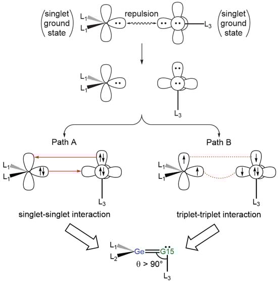 To understand the chemical bonding of the Ge=G15 double bond, valence bond theory suggests dividing the (L1L2)Ge=G15L3 molecule into two units: (L1L2)Ge and G15−L3 [56]. In terms of spin, two possible interaction pathways can merge the moieties to form a double-bonded (L1L2)Ge=G15L3 molecule in the singlet ground state. The first, the “singlet–singlet interaction” or “donor–acceptor interaction”, is [(L1L2)Ge:]1 + [:G15–L3]1 → [(L1L2)Ge=G15L3]1 (path A), and the second, the “triplet–triplet interaction” or “electron-sharing interaction”, is [(L1L2)Ge:]3 + [:G15–L3]3 → [(L1L2)Ge=G15L3]1 (path B). The valence bond orbital interactions are illustrated in Figure 1. As presented in Figure 1, our theoretical study indicates that the bond angle ∠Ge–G15–L3 in (L1L2)Ge=G15–L3 assumes a bent geometry, likely greater than 90° due to steric hindrance from the ligands. Fulton et al. [42,43] corroborate this with X-ray data, showing a bond angle of 126.66° for ∠Ge–N–MesC in Ge=N-Rea, which aligns with our theoretical findings.